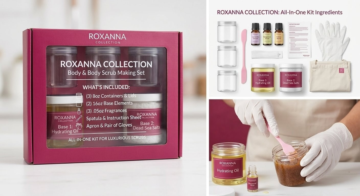 Skab din egen luksuriøse hudplejeoplevelse med Roxanna Collection Body Butter & Body Scrub Making Kit. Dette alt-i-et gør-det-selv-sæt indeholder alt, hvad du behøver for at lave nærende bodysmør og eksfolierende scrubs hjemmefra.